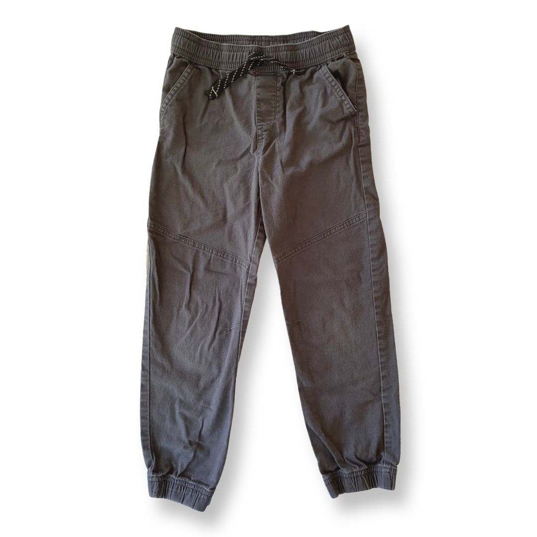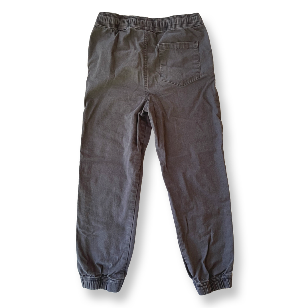 Lightweight chino fabric in jogger style with elasticated waistband and cuffs. Functional nylon drawstring. Front pockets and once back pocket. Bluish-grey color.