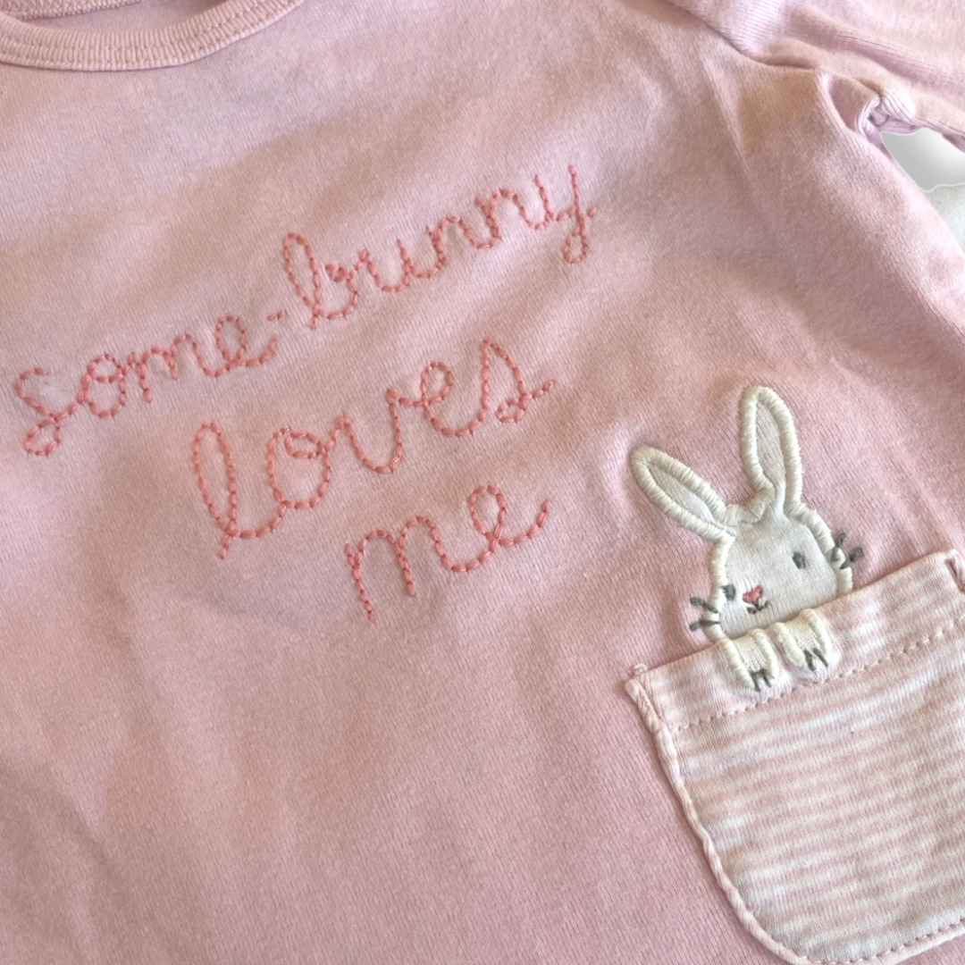 Baby pink long-sleeve top with "some-bunny loves me" embroidered across the front and a cute bunny peeking out of the patch pocket. Two buttons at shoulder for an easy on/off.