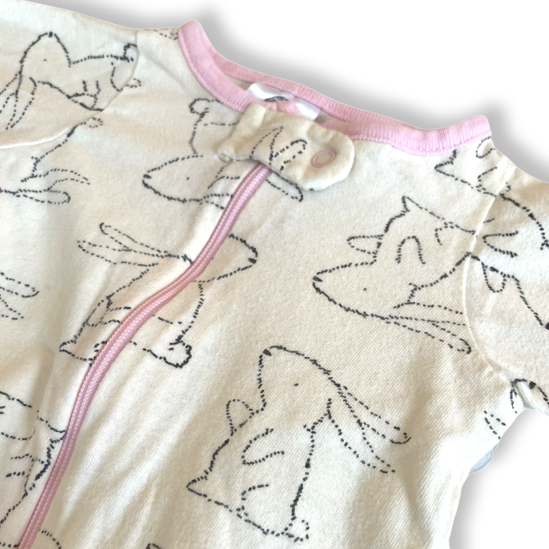 Sweetest bunny print on this tiny sleep & play. Cream with light pink trim and zipper. Zips from the top. Fold-over hand mitts.