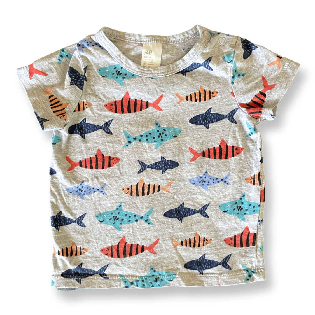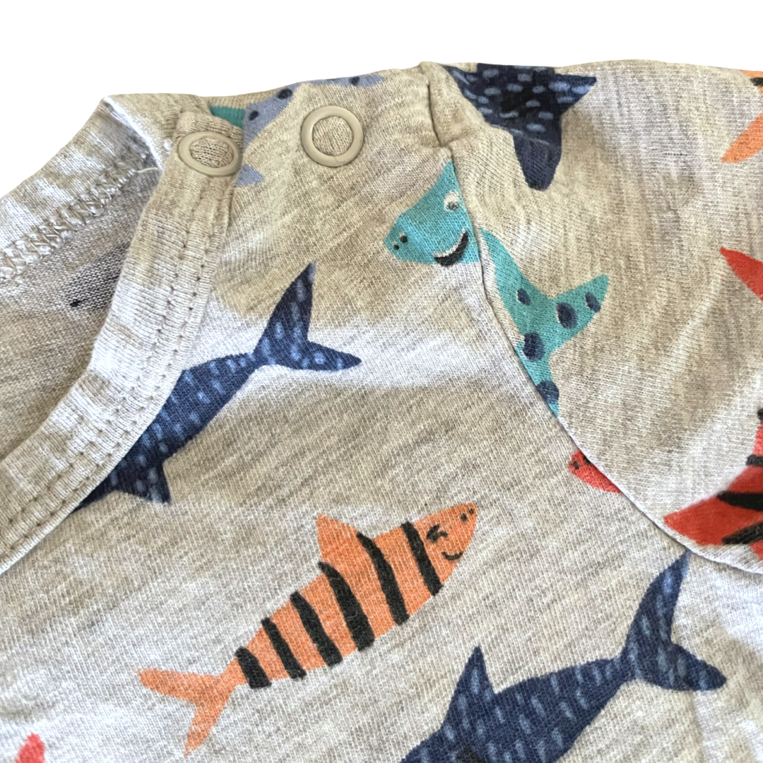 Colorful, smiling sharks on a light grey background. Snaps at left shoulder for easy dressing. Summerweight.