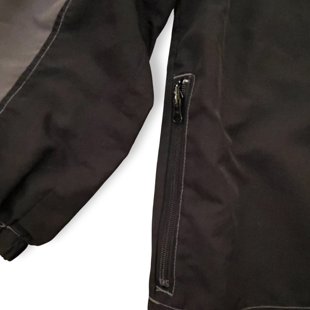 Hooded windbreaker in black and medium grey. One zippered pocket, one open pocket.