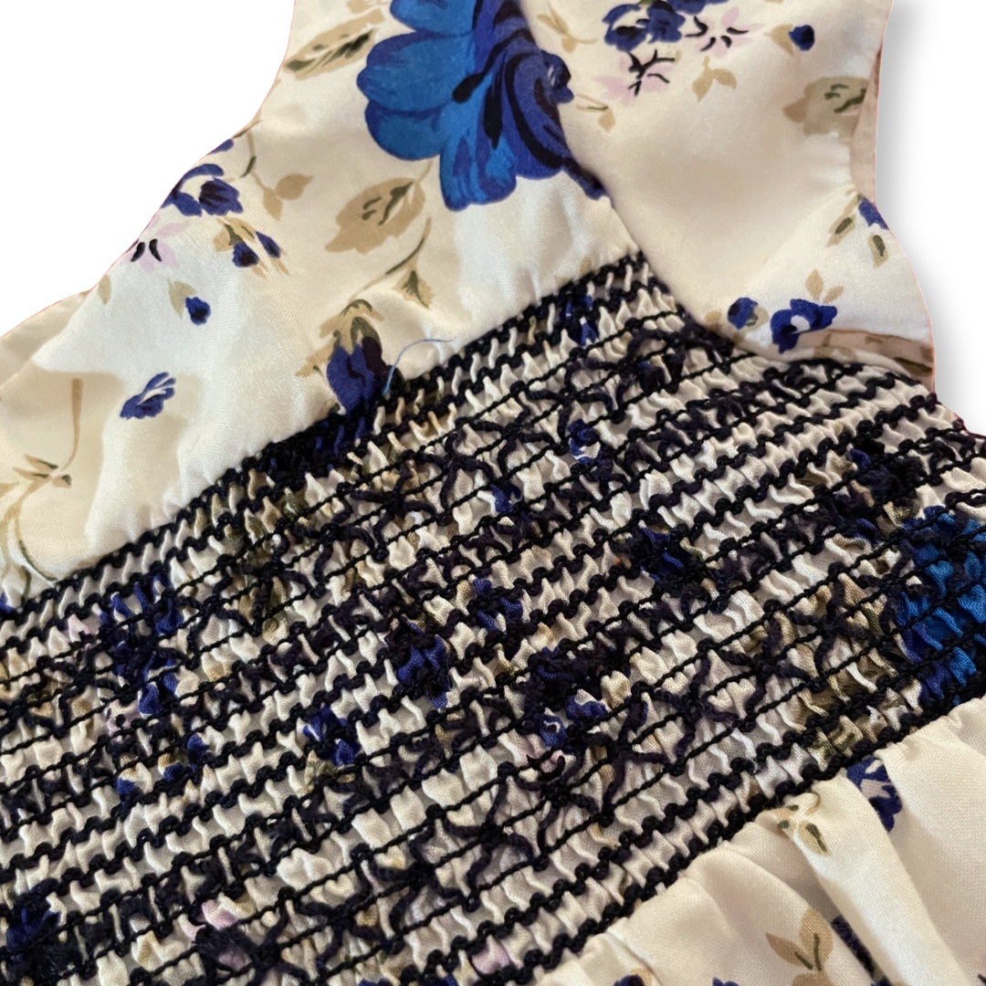 This one's a beauty. A special occasion dress with full lining, smocked top, and tie in the back. Large and small blue flowers on white fabric. Formal but lightweight and breathable.