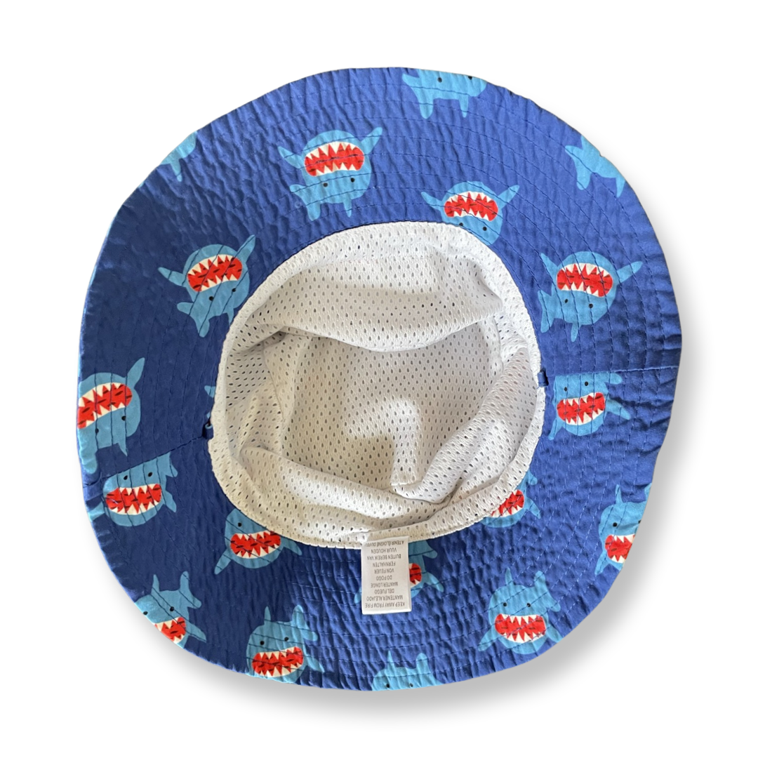 Toothy sharks swim in a sea of blue on this fun baby sun hat.