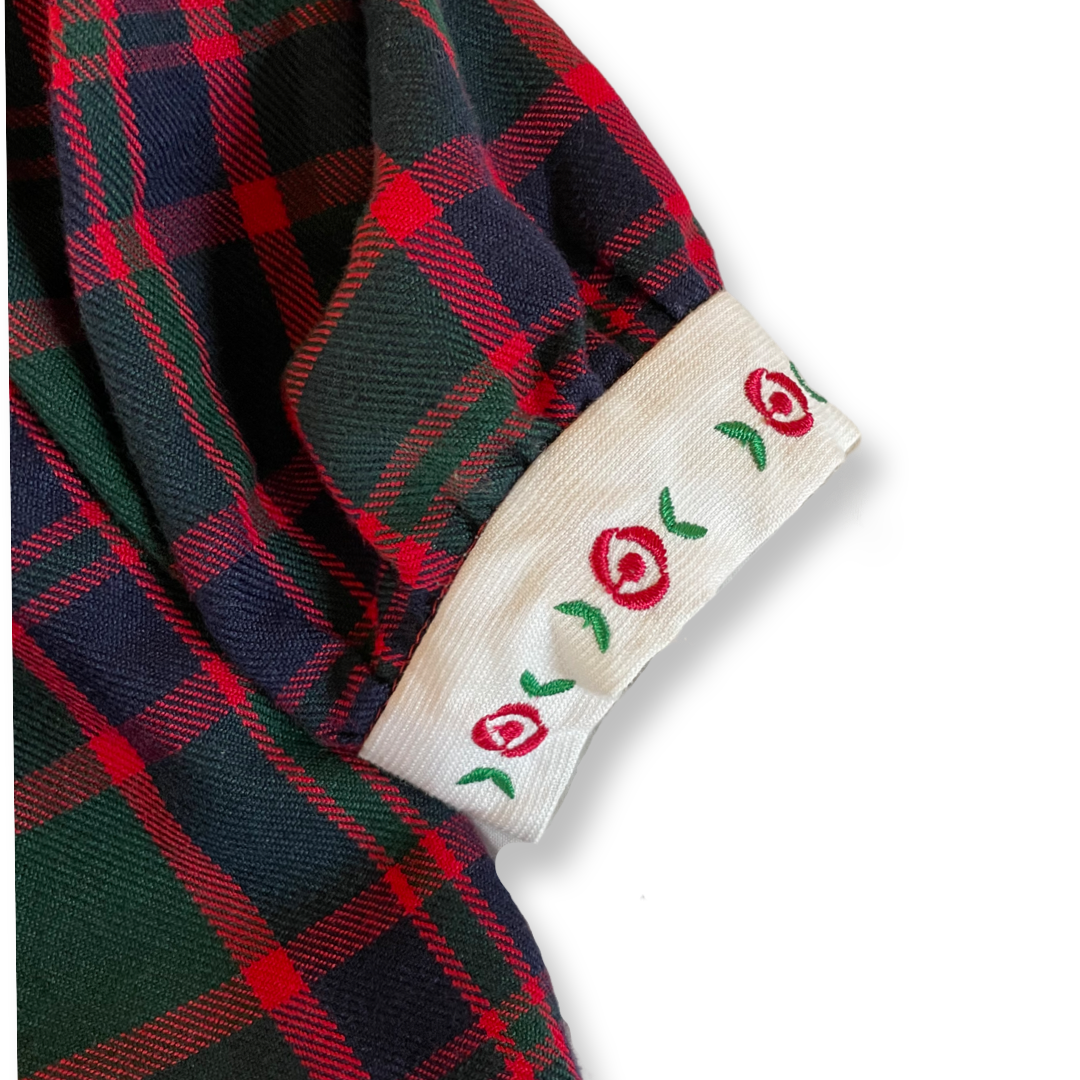 A darling vintage dress in green-navy-red plaid, with smocked waist and embroidery, and velvet details. Plus a matching hat!