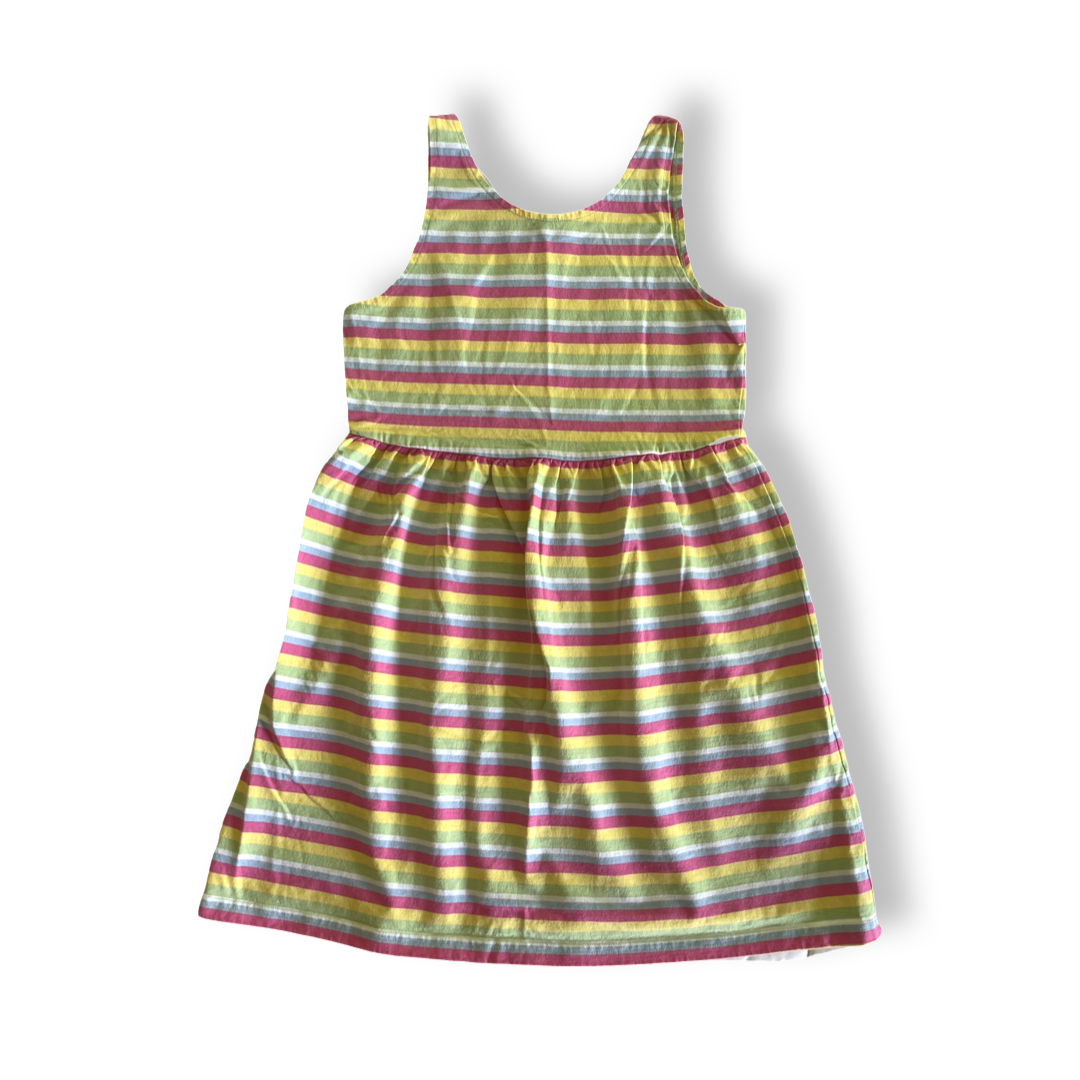 Classic sundress silhouette in pink, yellow, green, white, and blue stripes.